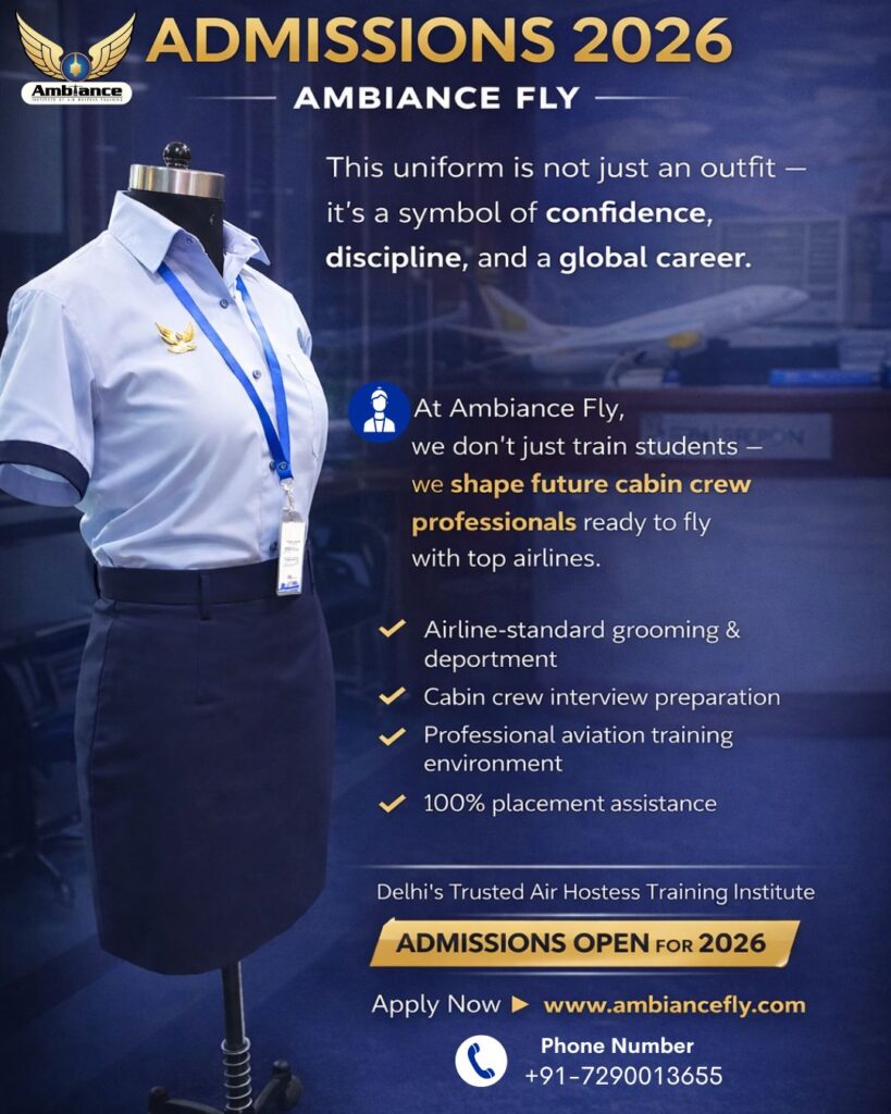 Ambiance Fly is one of the Best Air Hostess Training Institute in Delhi India, conducts Diploma and Certificate course in Air Hostess Course/Cabin Crew Course, Airport Ground Staff Training, Hospitality Management Course, Air Ticketing and Travel & Tourism with job placement. Our training modules, coupled with our placement assistance facility, help them secure coveted positions in airlines and hotels. That is why everyone likes Ambiance Fly Institute which is located